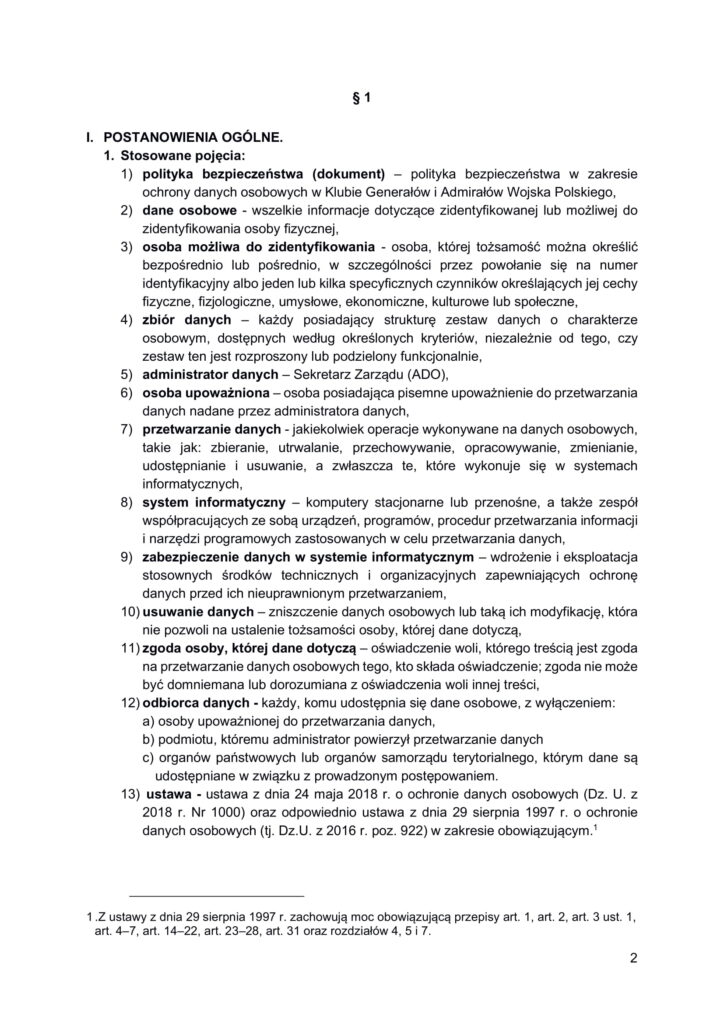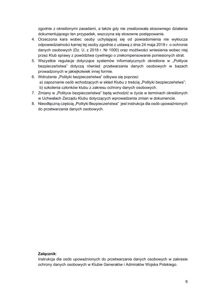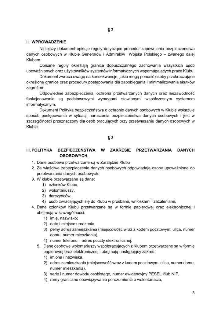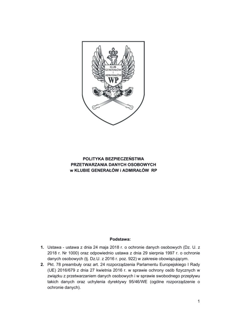 Polityka bezpieczeństwa przetwarzania danych osobowych w Klubie Generałów i Admirałów RP
